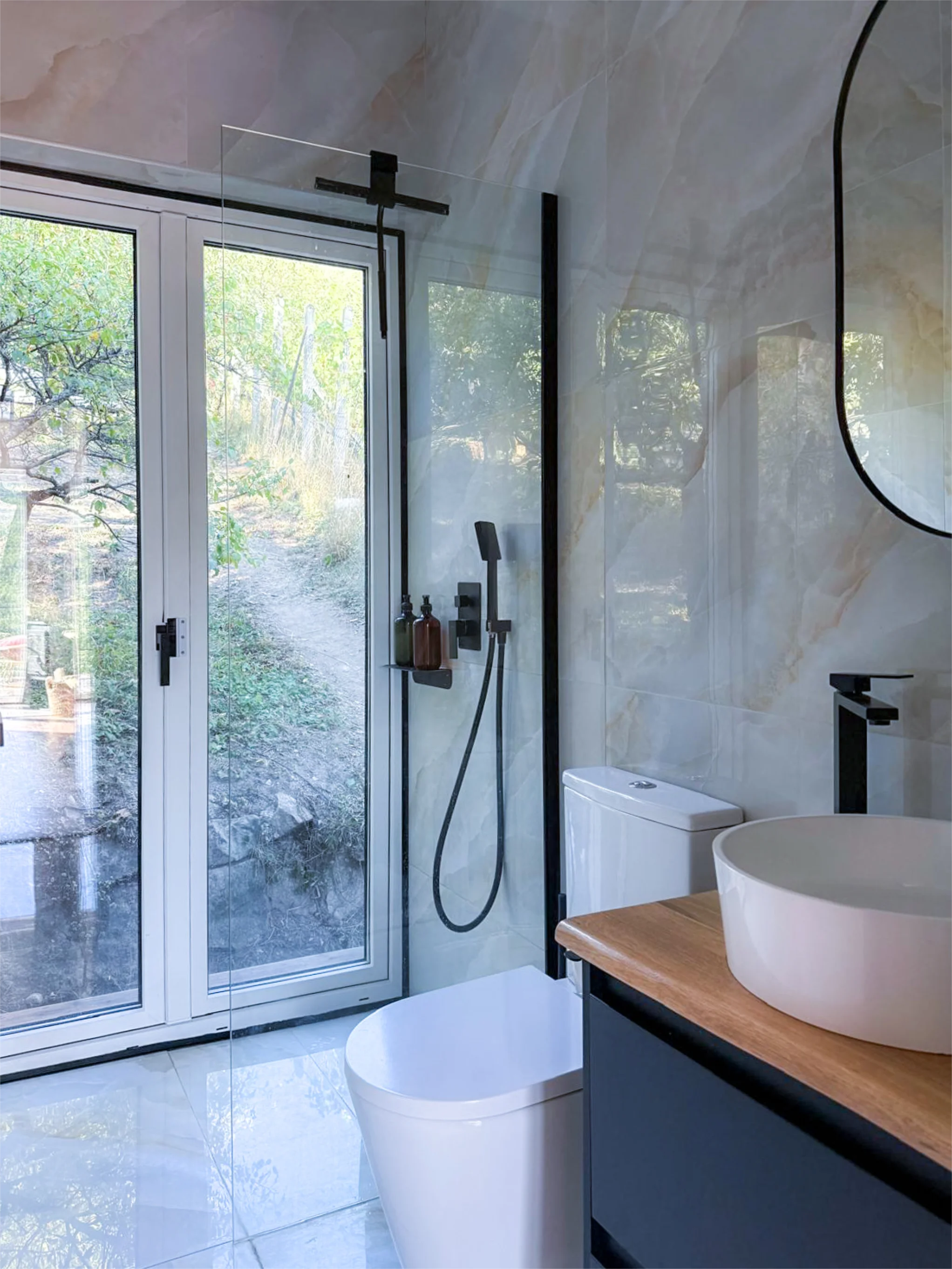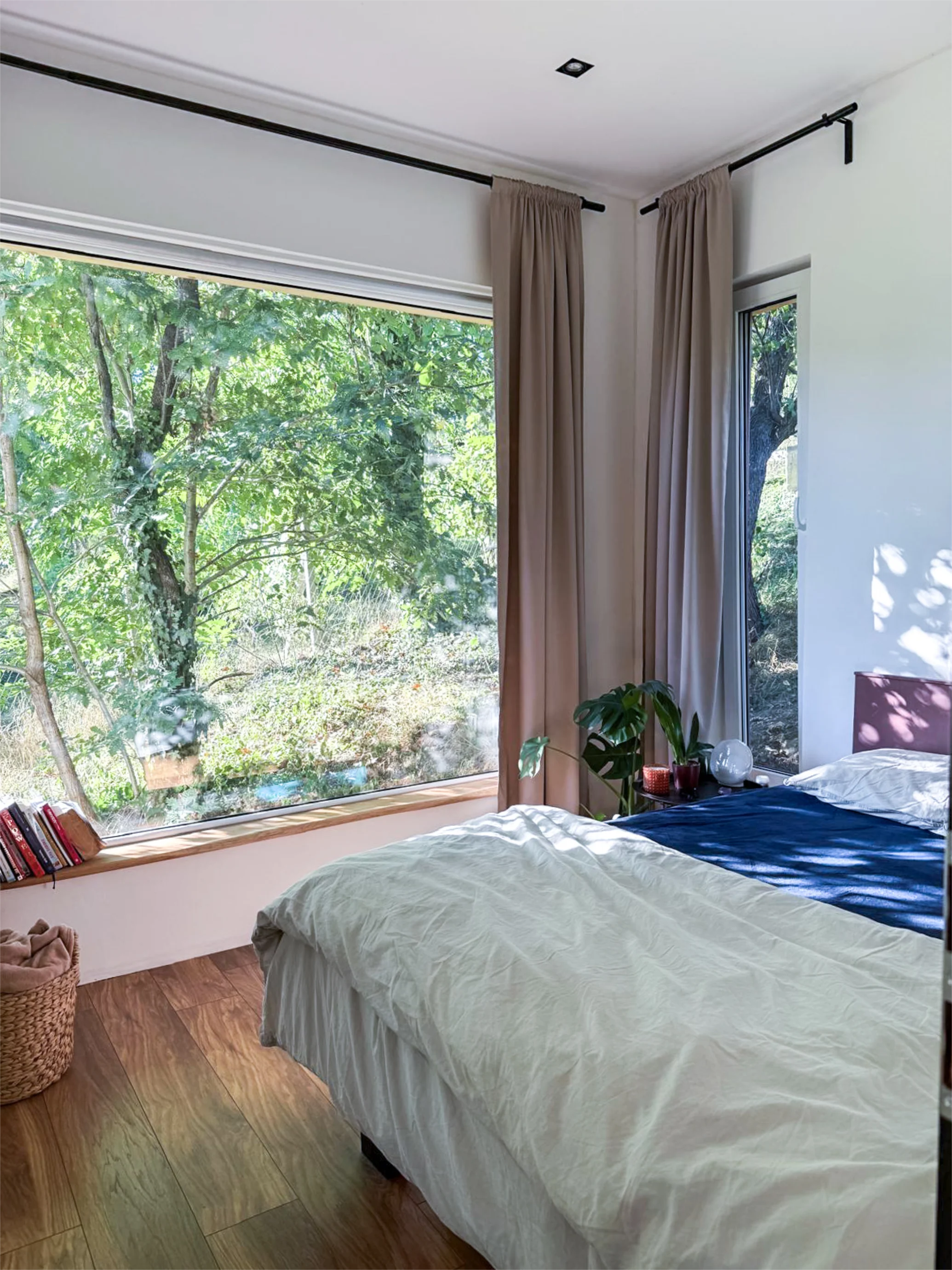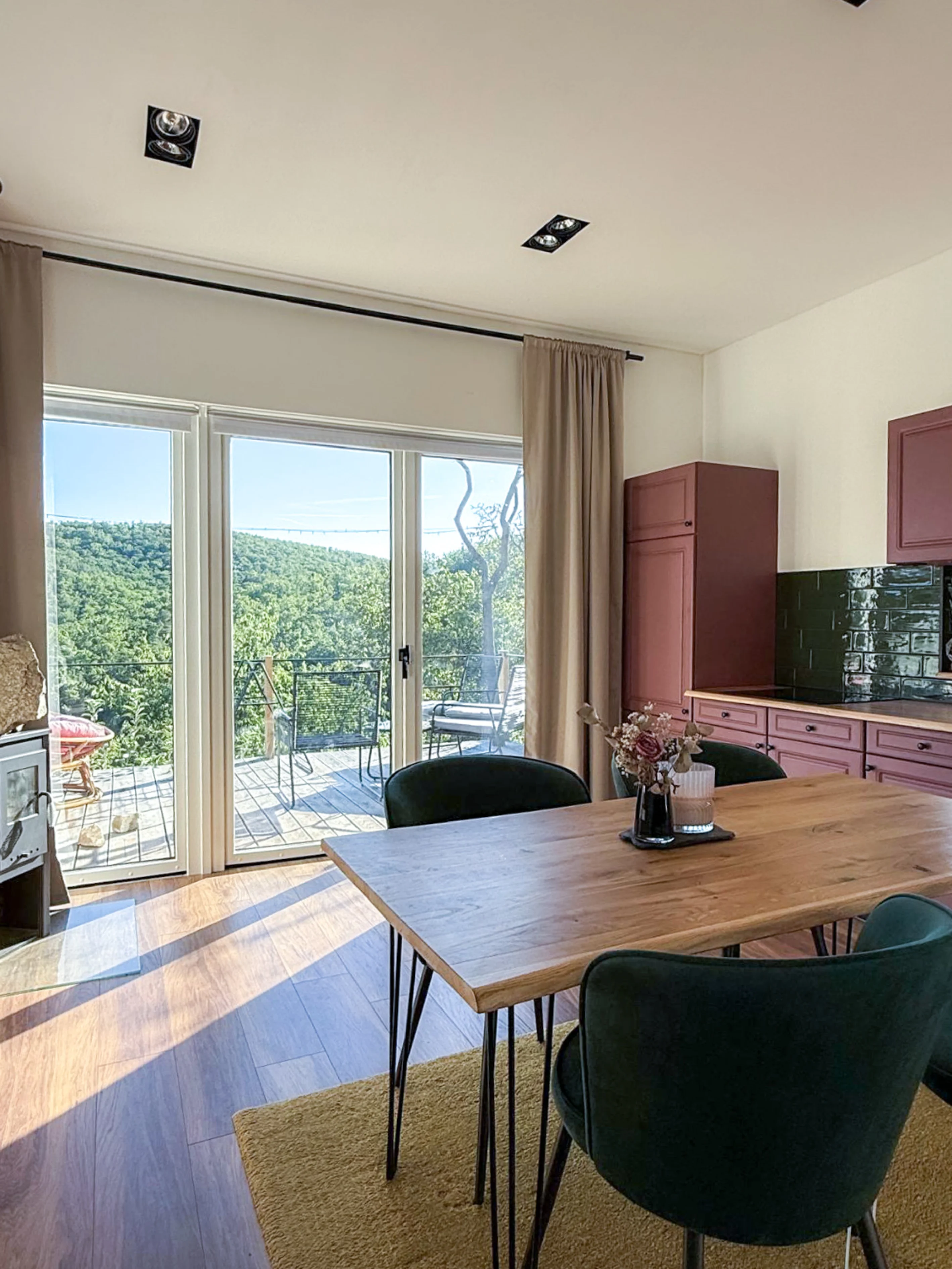 Interiér spojuje masivní dubové dřevo, zrcadlové plochy, odstíny mauve a tmavě zelené, doplněné o přírodní materiály a černé akcenty.